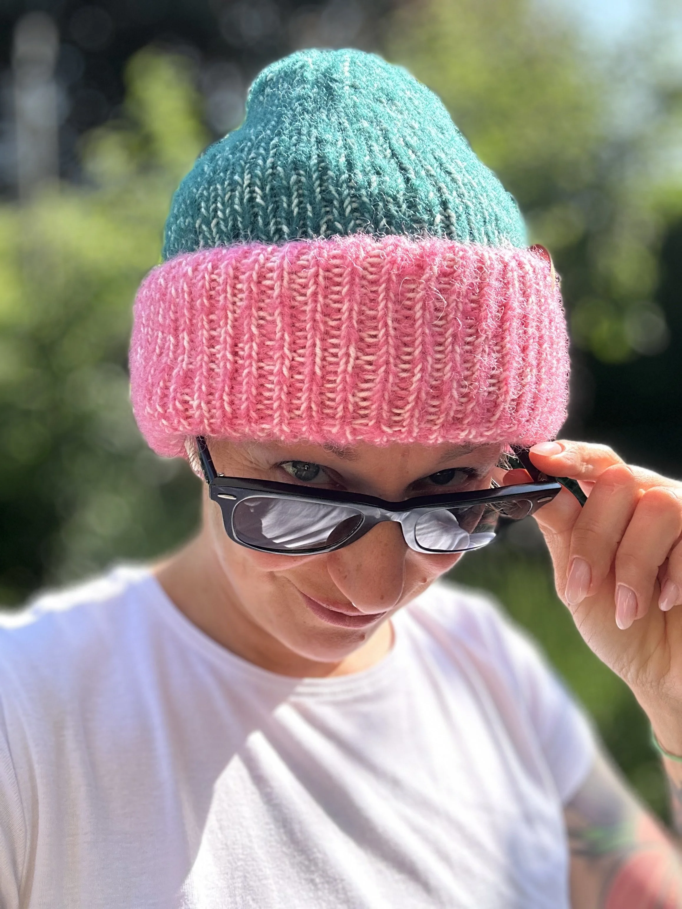 - doppelter Umschlag (3 Lagen Strick über dem Ohr)