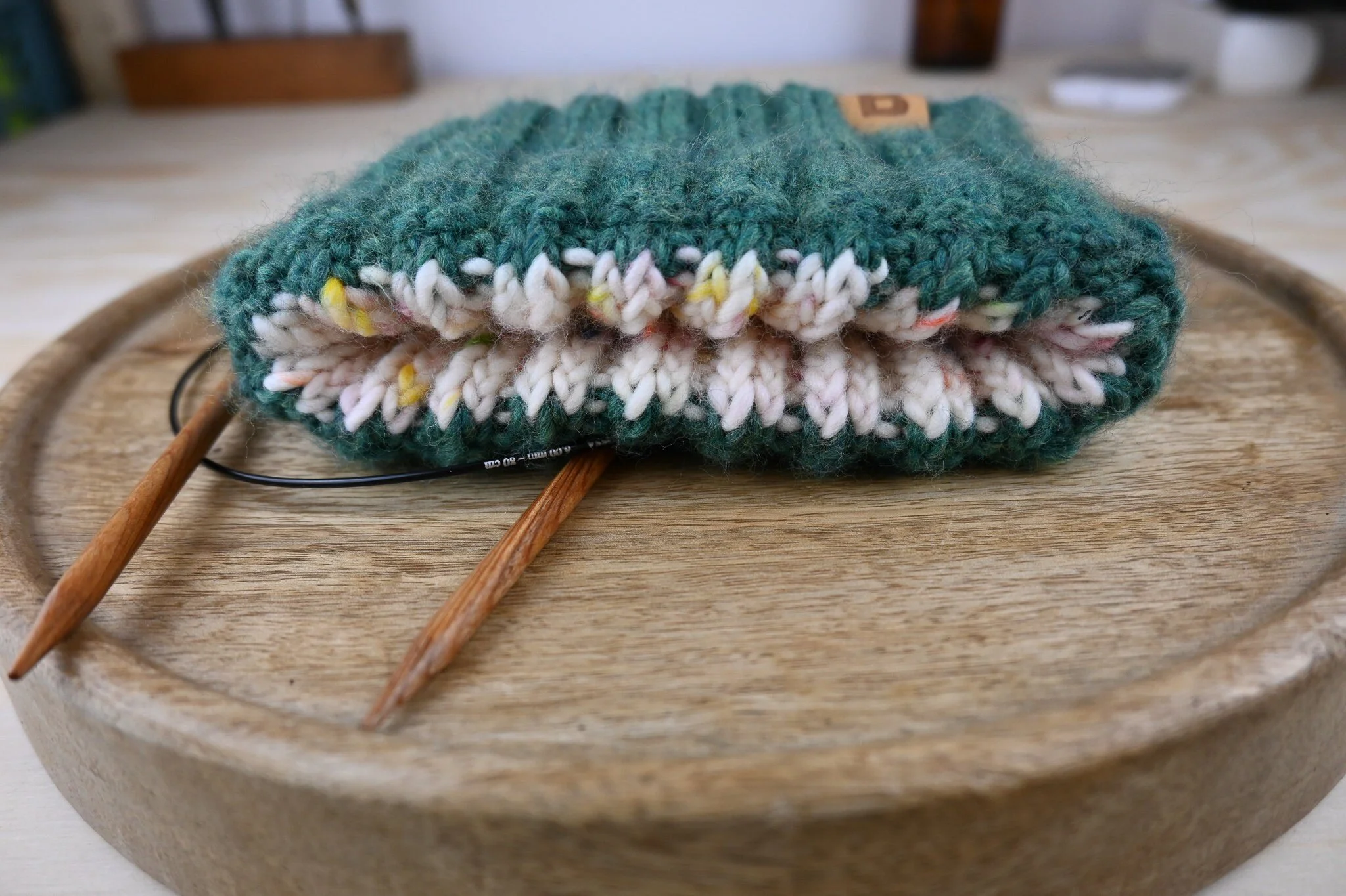 Grob gestrickt mit einer 8mm Nadel im Patentmuster (Fishermans Stich).