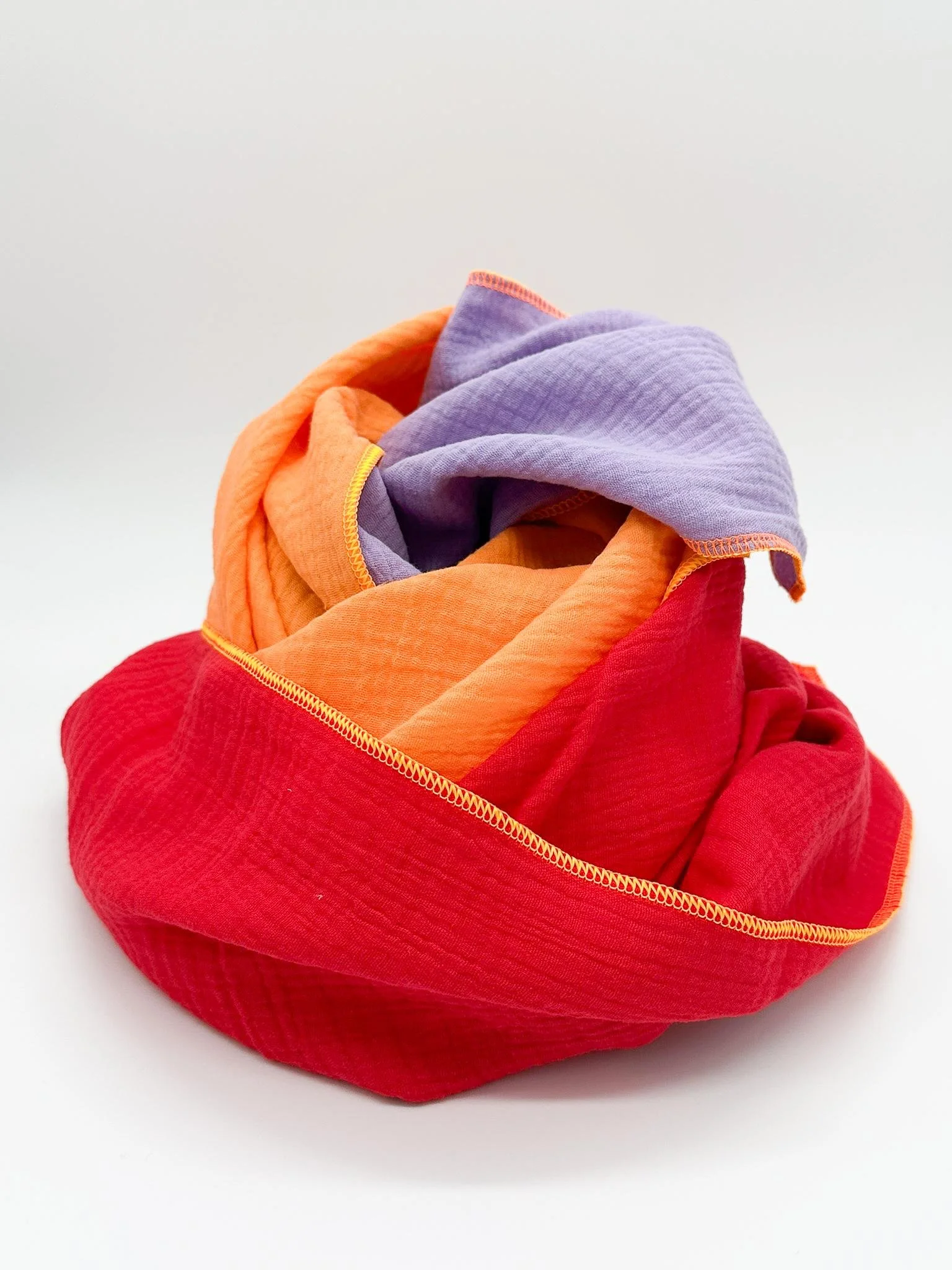 Musselinschal SCARF in Lila-Rot-Orange mit orangen Overlockrand